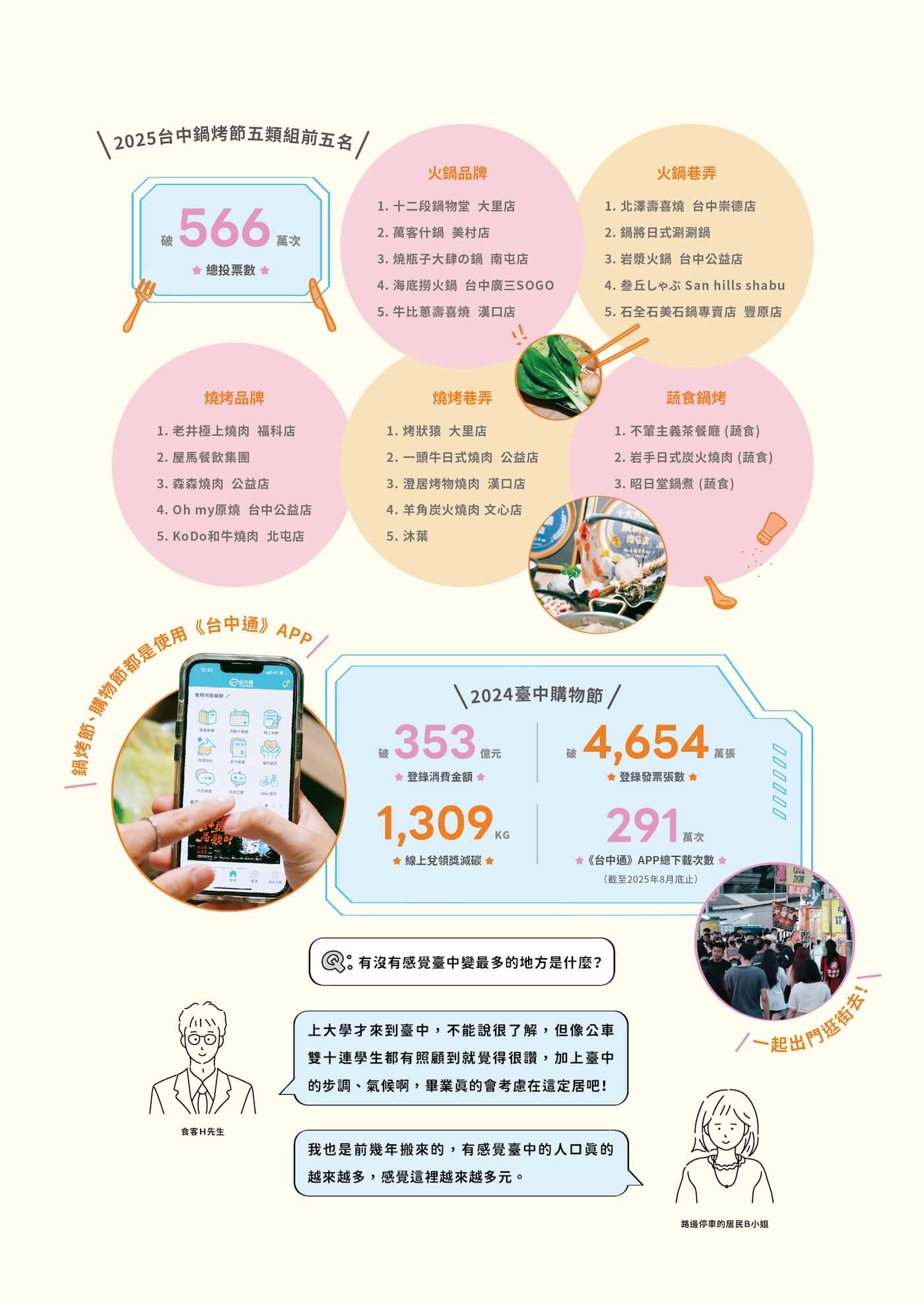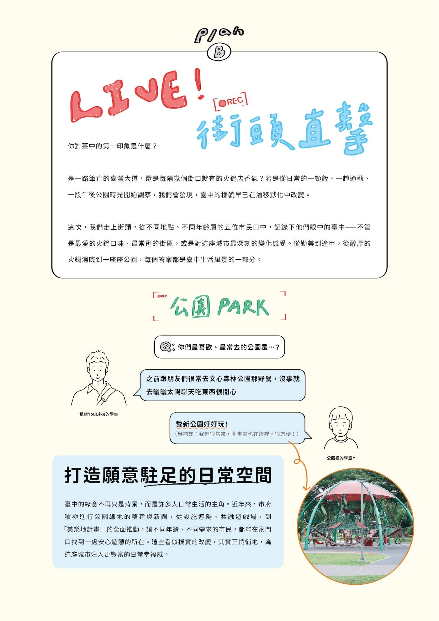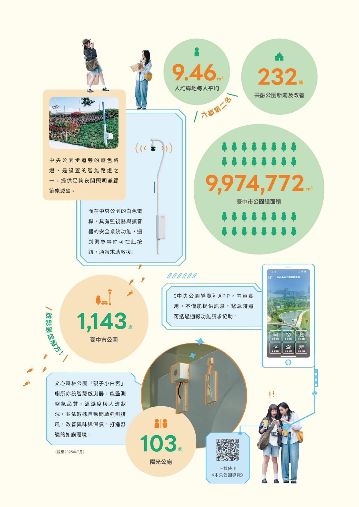LIVE!街頭直擊 從公園綠意到夜市人潮,臺中以智慧交通與數位服務,讓日常生活多一份便利與驚喜。 從公園綠地的改善,到智能設施、行人友善環境,城市不只是提供休憩空間,更是幸福感的延伸。無論是散步公園、搭乘大眾運輸,或是享受美食,這些看似平凡的日常,正是臺中以智慧城市治理讓生活「加值」的最佳詮釋。