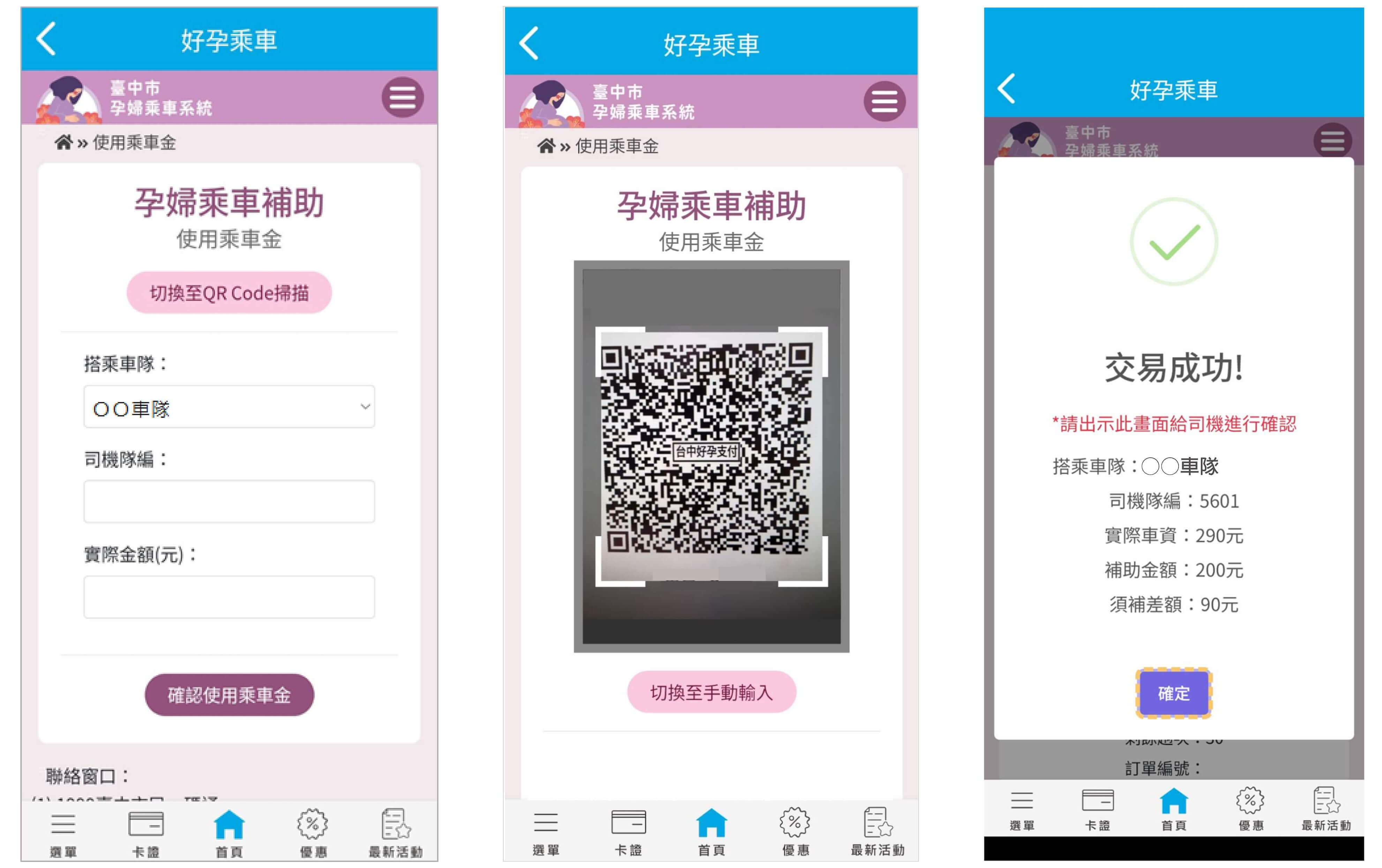 這款臺中市數位局底下的平台,原本就包含資料串接的核心模組,過去運行臺中購物節等大型活動證明其穩定性。數位局在此基礎上加上一個「好孕乘車」專區,申請、審核、掃碼扣抵一氣呵成,計程車司機顯示付款QR Code,孕媽咪用手機掃碼即可。涵蓋臺中、苗栗、彰化、南投,孕婦可於補助期間內搭乘 30 趟,每趟最高補助 200 元,不限用途、不限距離,只要車隊系統能掃碼扣點,就能使用。